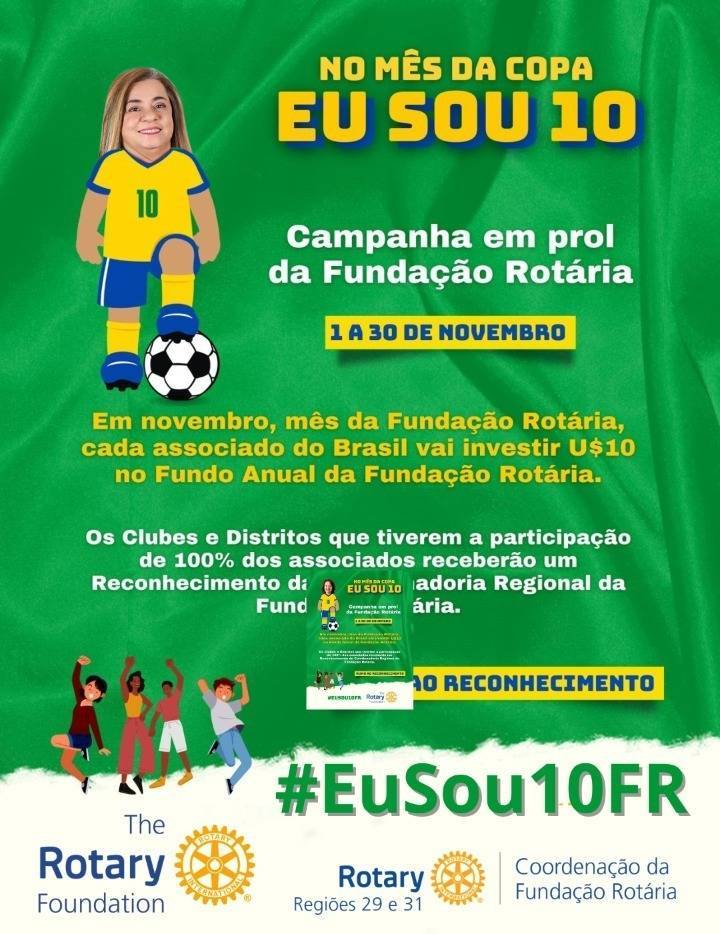 Em Novembro, mês da Fundação Rotária, cada associado do Brasil é convidado a investir US$ 10 no Fundo Anual da Fundação Rotária e entrar para o Time: #EuSou10FR. Para participar, faça sua doação: